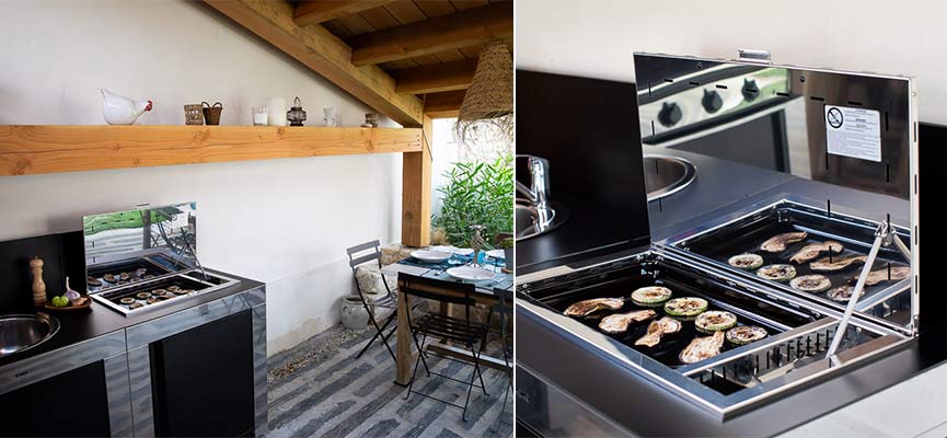 A spacious outdoor worktop is essential for food preparation, food presentation, and creating a functional workspace. For added convenience, our outdoor kitchen worktop modules are equipped with storage space for all your utensils, cooking accessories, and even your dishes. Several storage options are available: drawers or shelves, depending on your tastes and needs!