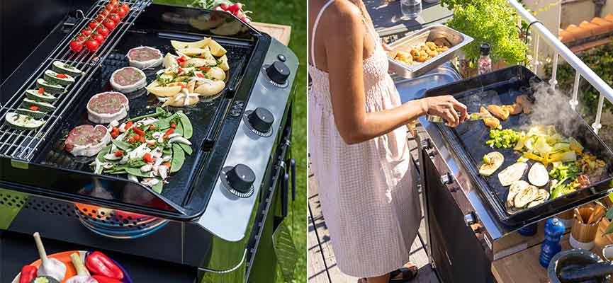 The gas griddle offers unmatched culinary versatility that goes well beyond the capabilities of a charcoal or wood fire barbecue. Thanks to its smooth surface and even heat distribution, you can cook all kinds of food : from meats to classic vegetables, fish to desserts (fluffy pancakes, or even flambéed bananas).